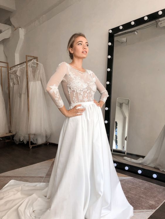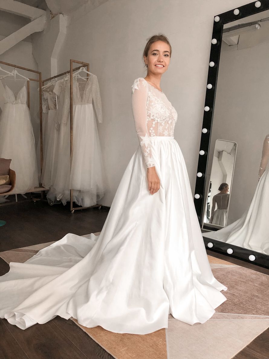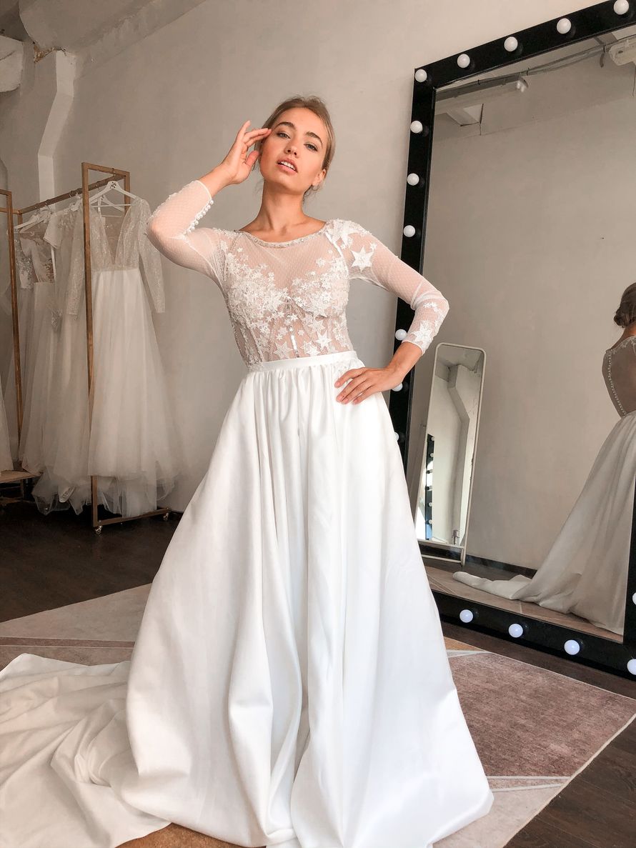 Свадебное платье стильное, Свадебное платье с длинным шлейфом, Свадебное платье вышивка звездами и декоративной тесьмой, Свадебное платье расшитое бисером, стеклярусом и пайетками, Свадебное платье юбка с карманами, Свадебное платье с рукавами