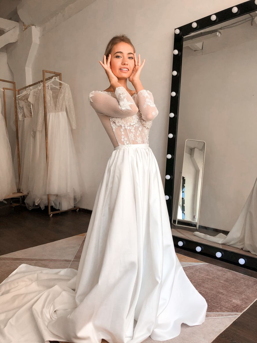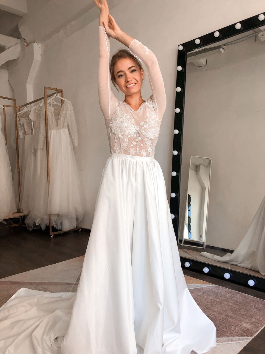 Стильное свадебное платье с длинным шлейфом. Лиф с эффектом пушап из сетки в горошек, вышивка звездами и декоративной тесьмой. Дополнительно расшит бисером, стеклярусом и пайетками. Можно добавить чашки. Юбка с карманами